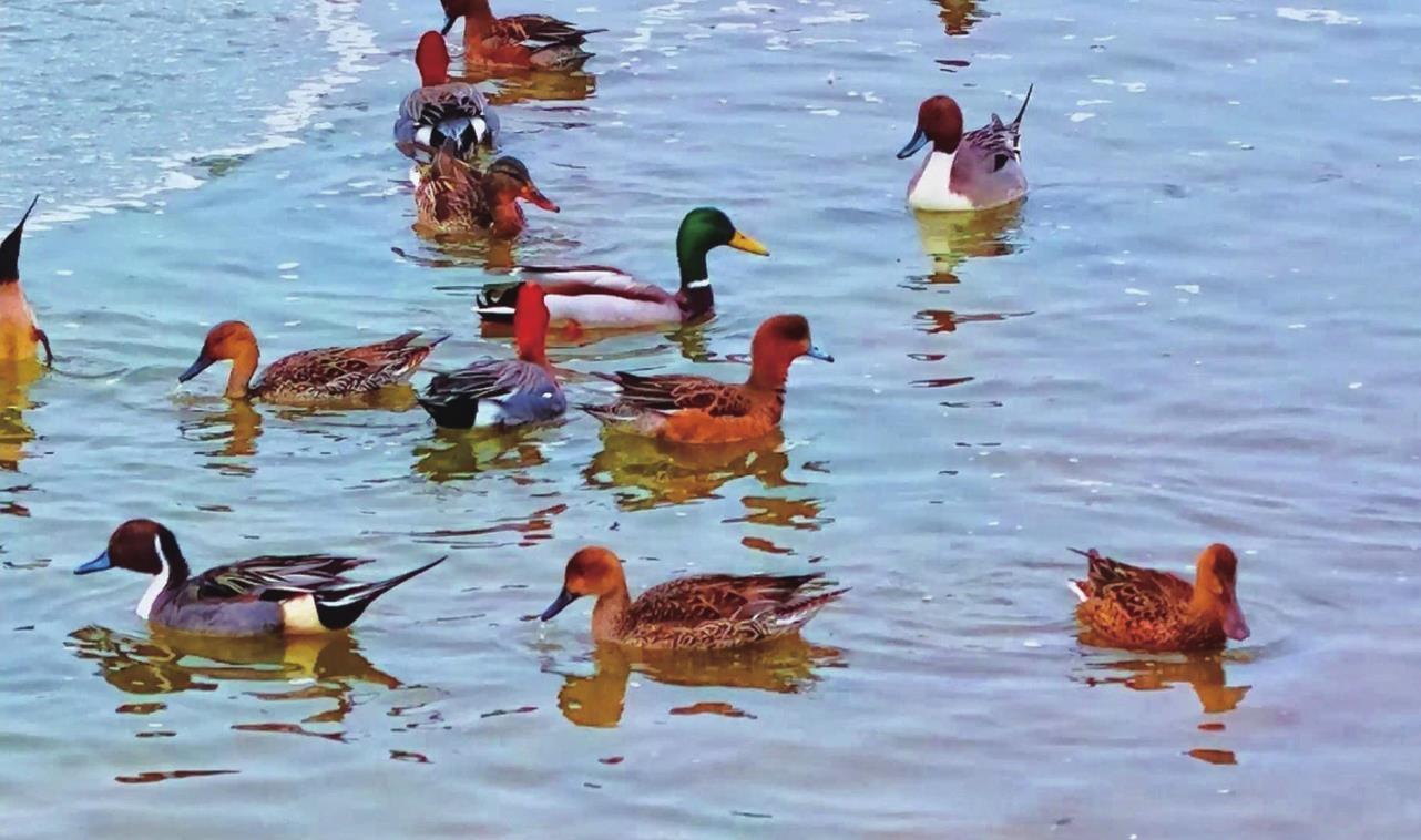 还有许多向北迁徙的雁鸭类候鸟落脚在乡镇、农场沿海养殖池塘里,它们成群出没,或低空翩跹,或比翼齐飞,或戏水觅食,或临空翱翔,形成一波又一波涌动的“鸟浪”。