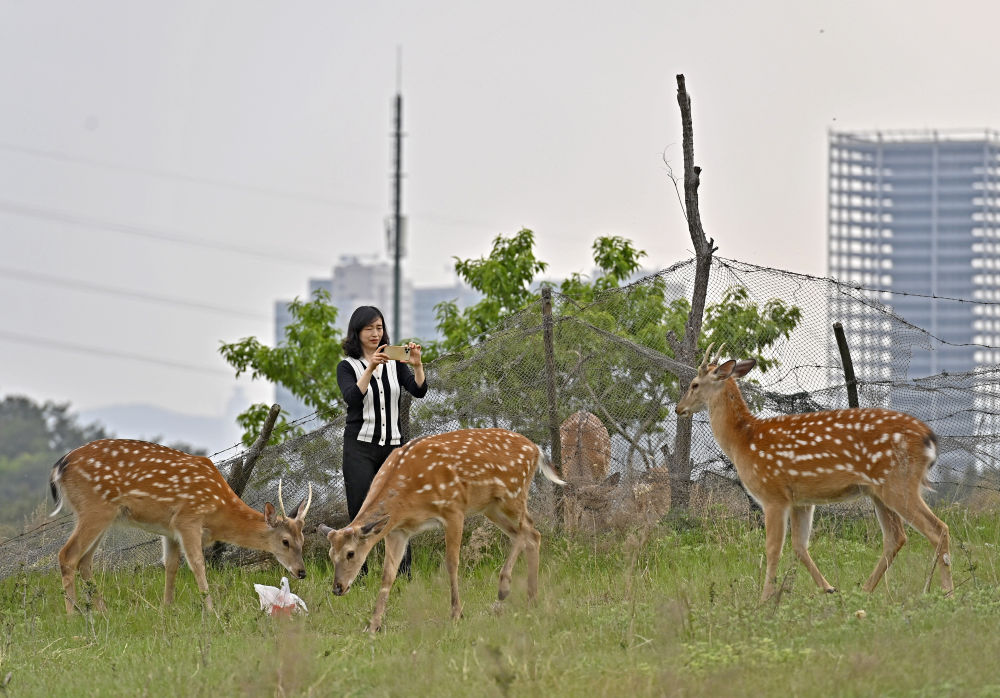 市民在辽宁大连市白云山山体公园给梅花鹿拍照(2025年5月21日摄)。新华社记者 周华 摄