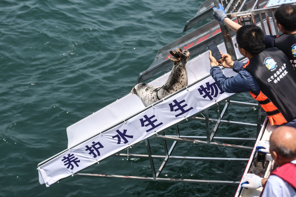 2025年6月6日,工作人员在放归西太平洋斑海豹。新华社记者 潘昱龙 摄