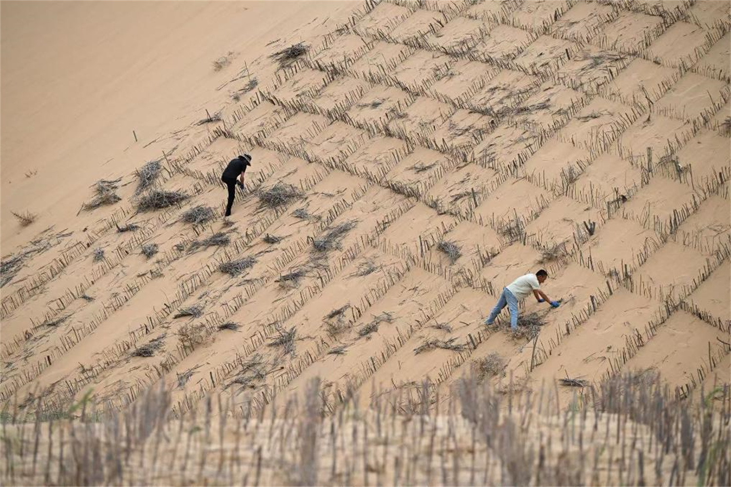 鄂尔多斯市达拉特旗农民在防沙治沙项目区铺设沙障。新华社发(杨耀中摄)