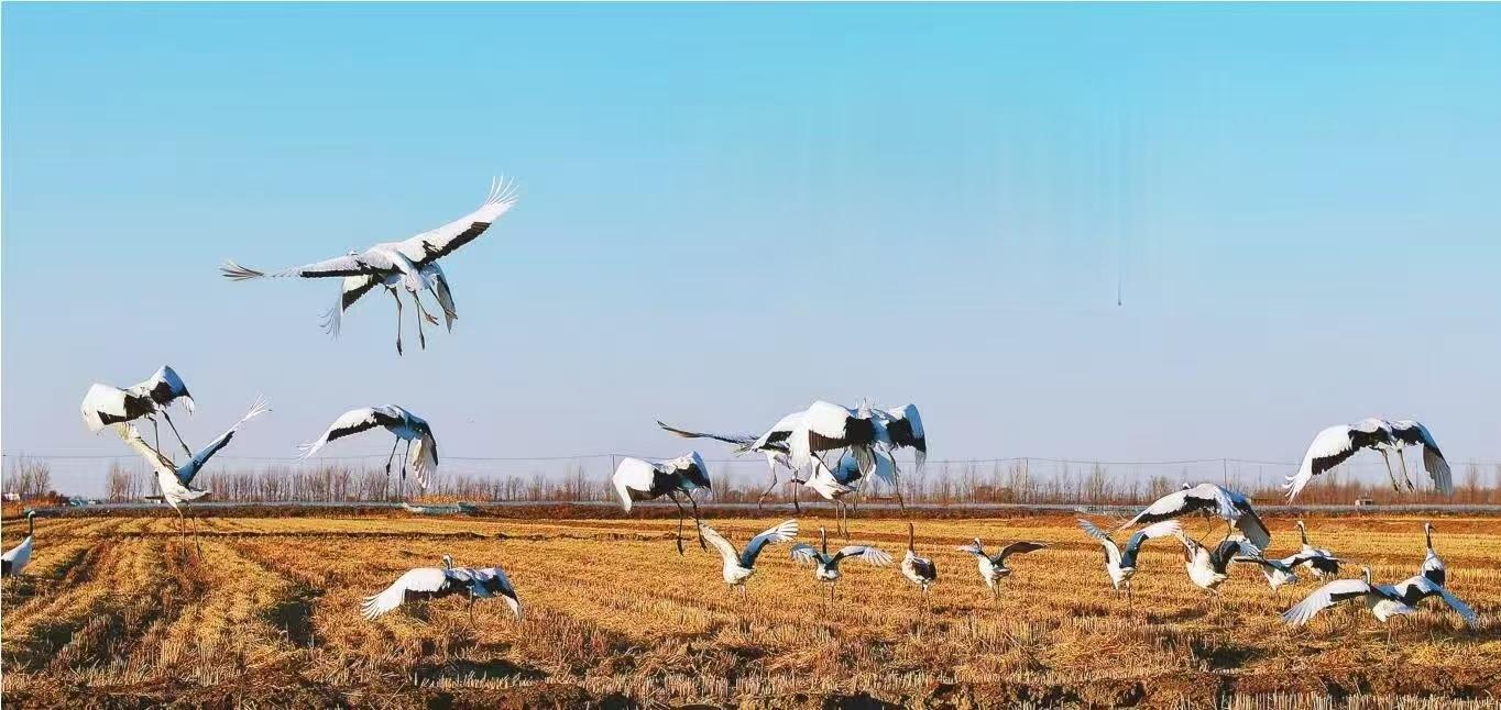十二月三日,盘锦市辽河三角洲地区收割后的稻田地里虽寒风刺骨,但近百只野生丹顶鹤仍在悠然自得地觅食休憩。得益于得天独厚的湿地生态系统,盘锦辽河口成为丹顶鹤南北迁徙最集中的停歇地和越冬的最北限。为了避免丹顶鹤的越冬生活受到人为干扰,保护区实施了全封闭管理、加大巡护力度、确保食物充足、构建“鸟类救助绿色通道”等措施,自二〇一〇年有五只丹顶鹤在此越冬后,数量逐年增加,盘锦也成为丹顶鹤大陆种群第三大自然越冬地。