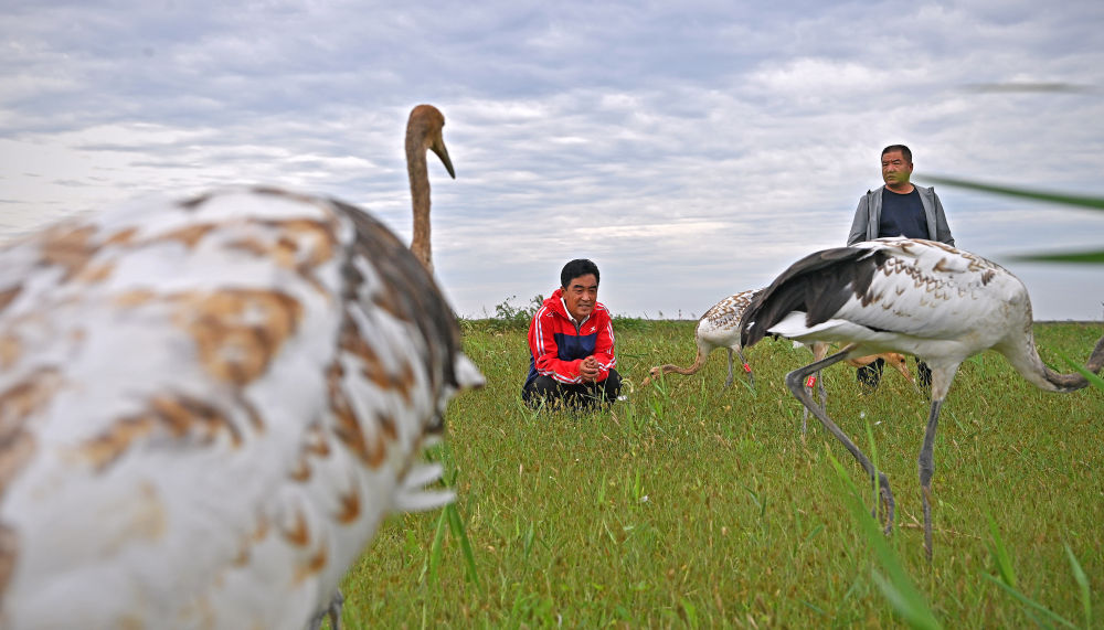 2024年9月11日,在辽河口国家级自然保护区鹤类繁育保护站野外,赵仕伟(左)和同事观察幼年丹顶鹤活动。新华社记者 周华 摄
