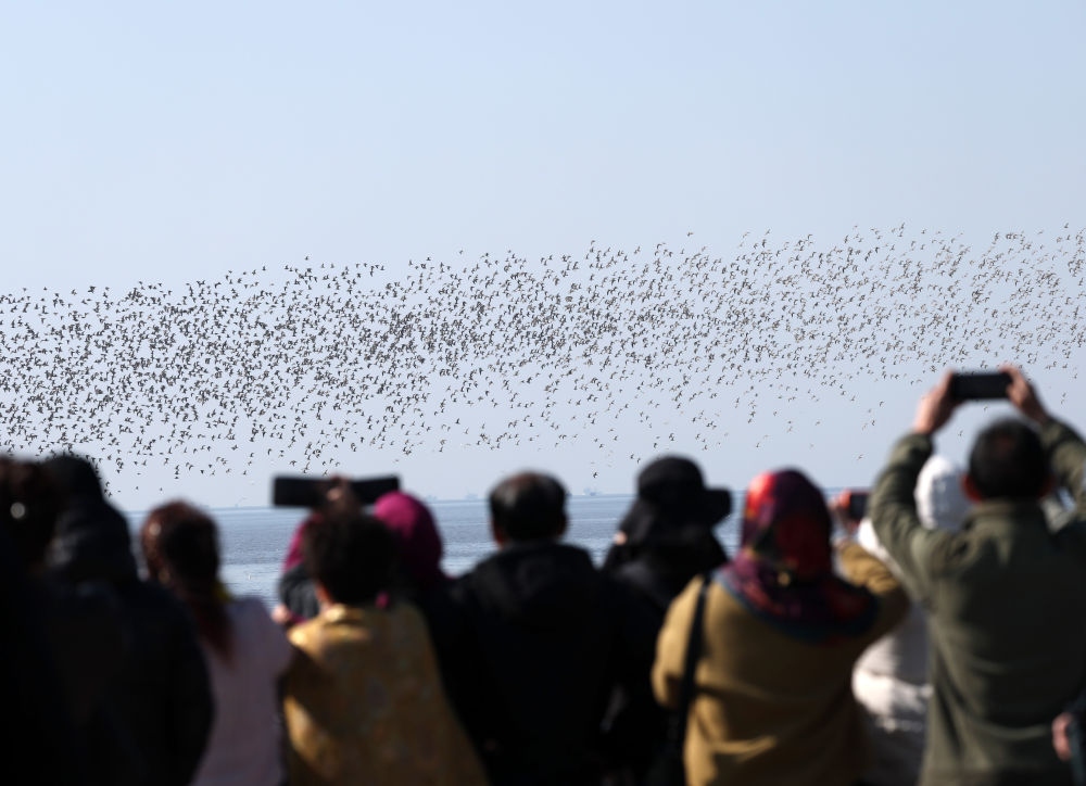 4月2日,游客在辽宁丹东鸭绿江口候鸟栖息地观看、拍摄“鸟浪”。新华社记者 李钢 摄