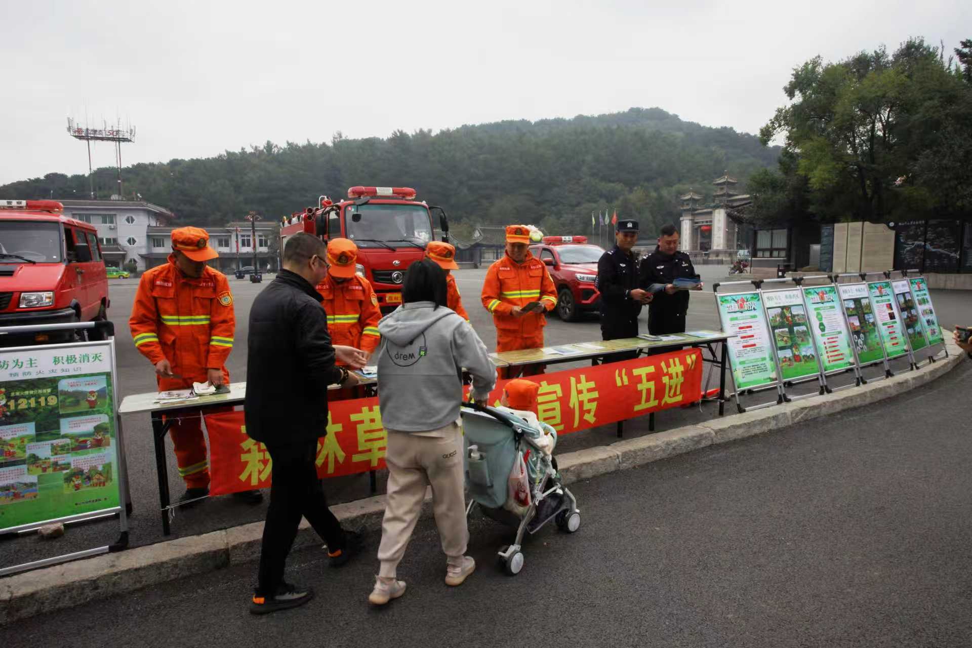 在AAAAA级风景旅游区--千山风景名胜区的大门口,游客中心室外大屏滚动播放着森林消防宣传片,防火宣传横幅、宣传旗、宣传板整齐排列,千山风景区森林消防队的队员们向进山的游客一边发放宣传资料,一边提示大家游玩时不要在山林里吸烟,不要使用明火。